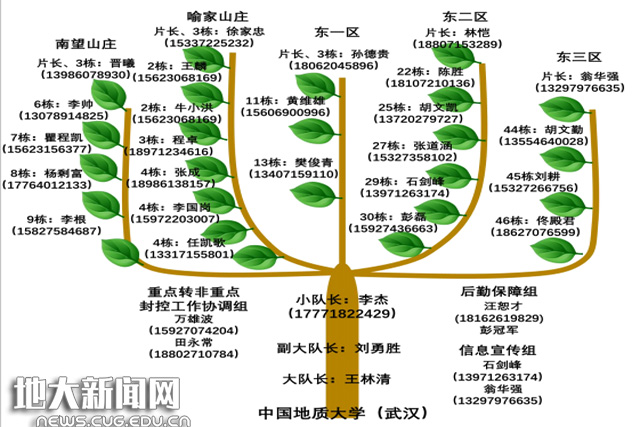 地大社区包括东区教职工小区、南望山庄和喻家山庄小区,现有住户1940户,常住居民5860人。目前对24个楼栋出现确诊或疑似病例的居民楼进行重点封控,成立了封控应急工作队,每批队员工作时间为一周,主要工作任务四项:一是全面、精准掌握重点封控楼栋住户信息、畅通信息传递渠道;二是为相关楼栋居民配送生活物资;三是转运生活垃圾;四是为部分确有急需的家庭提供取送药品、天然气圈存等服务。