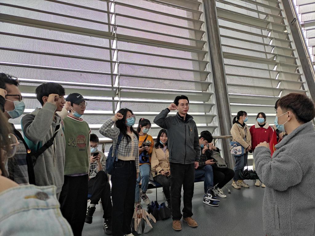 在中山舰前的二楼平台上,全体党员重温入党誓词,铿锵的言语中包含着坚定的强国志愿。