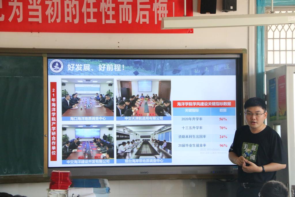 为吸引中学优质生源报考,6月25日,湖北省高考分数线公布当日,英国上市公司官网365海洋科学系博士生导师雷超、海洋工程与技术副教授董友扣、学工组辅导员陈杨一行走进武汉市第十四中学开展招生宣讲,并面向高三同学进行高考志愿填报解读。