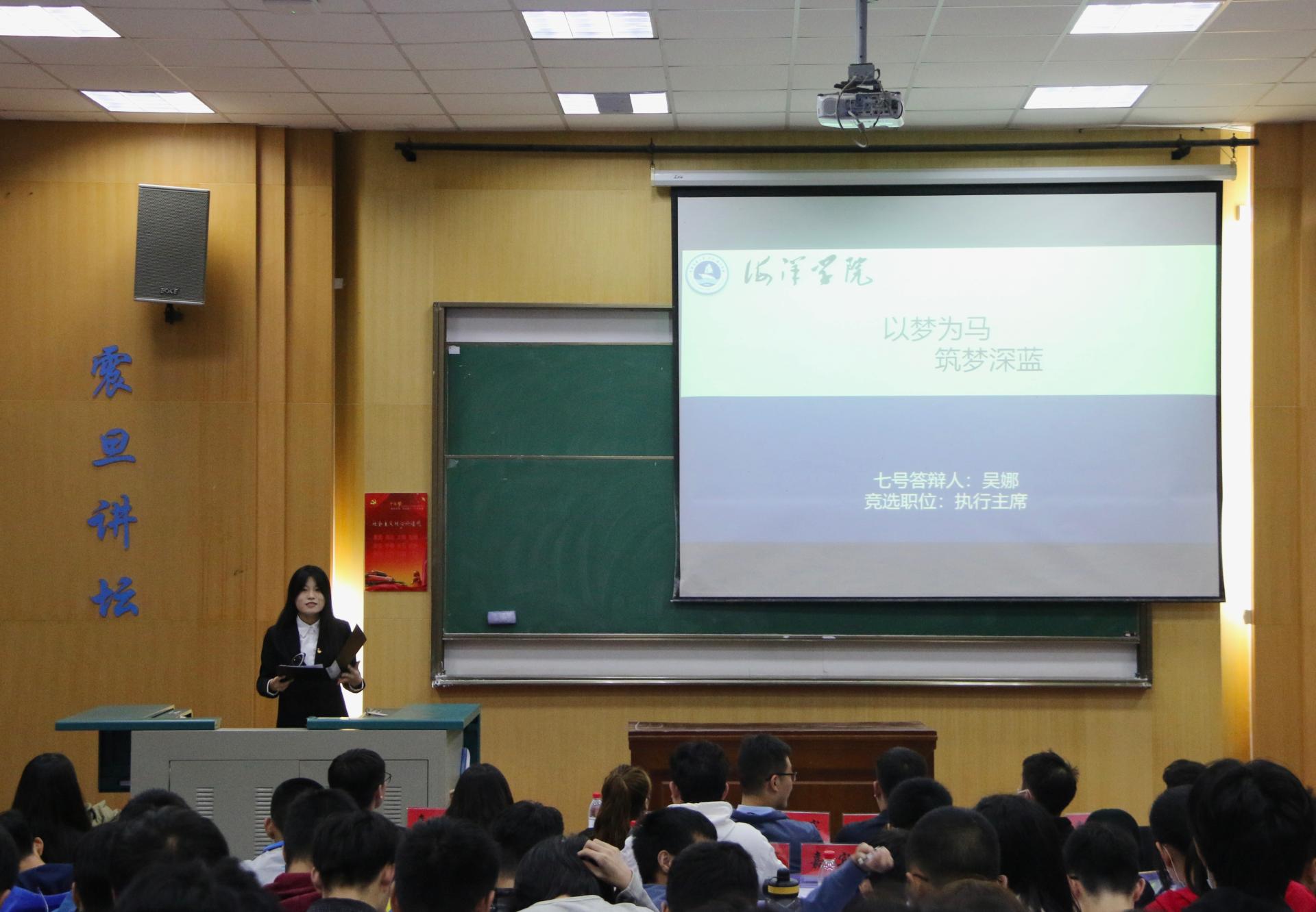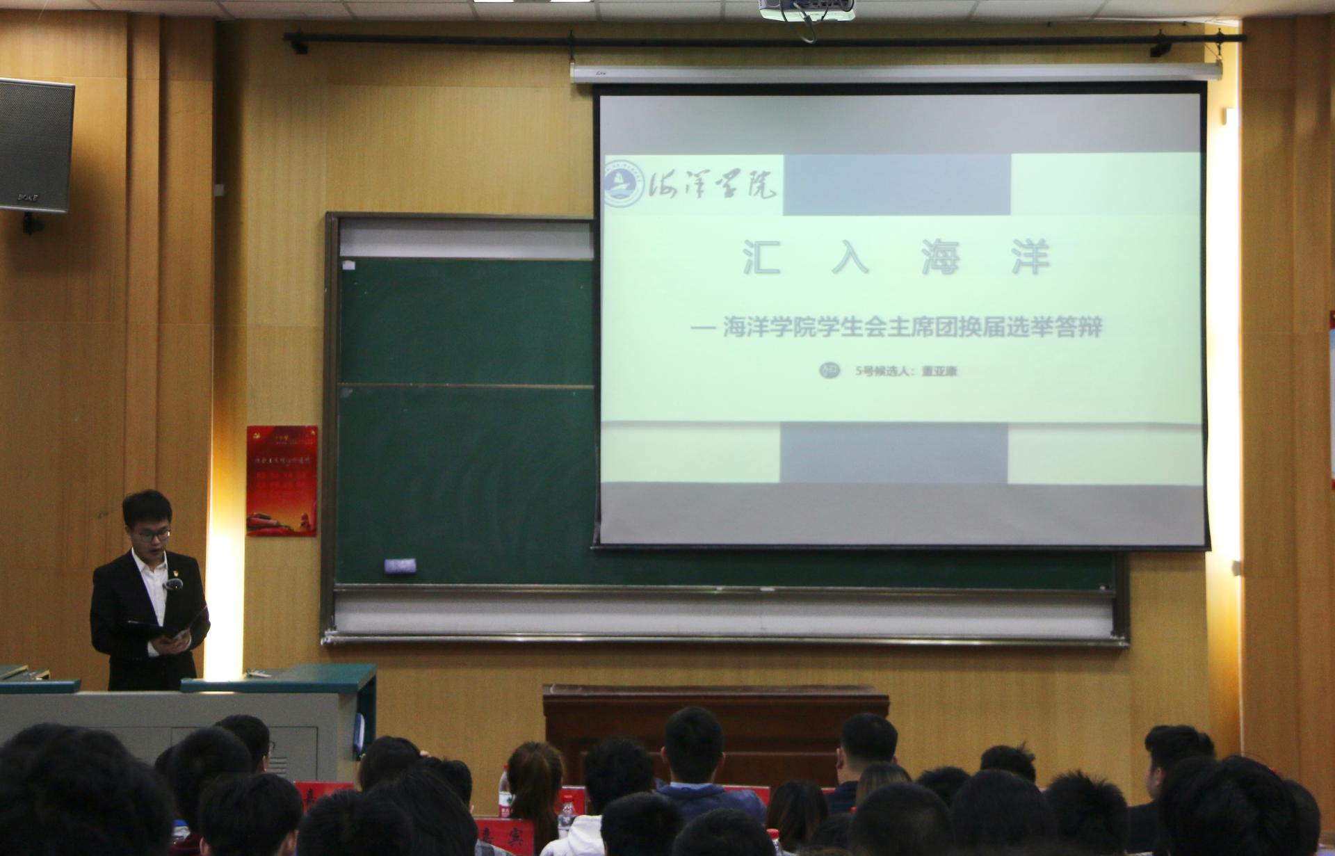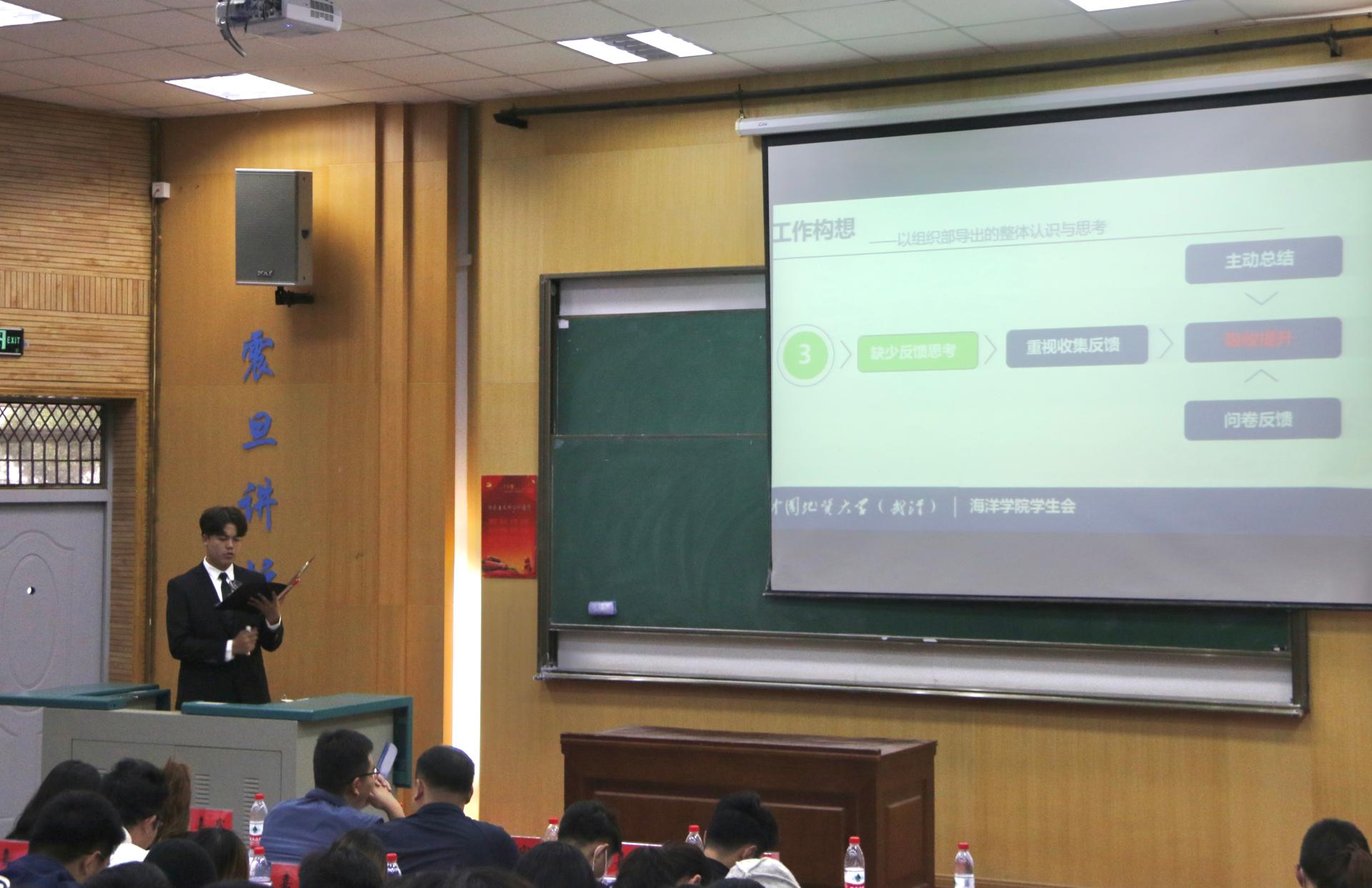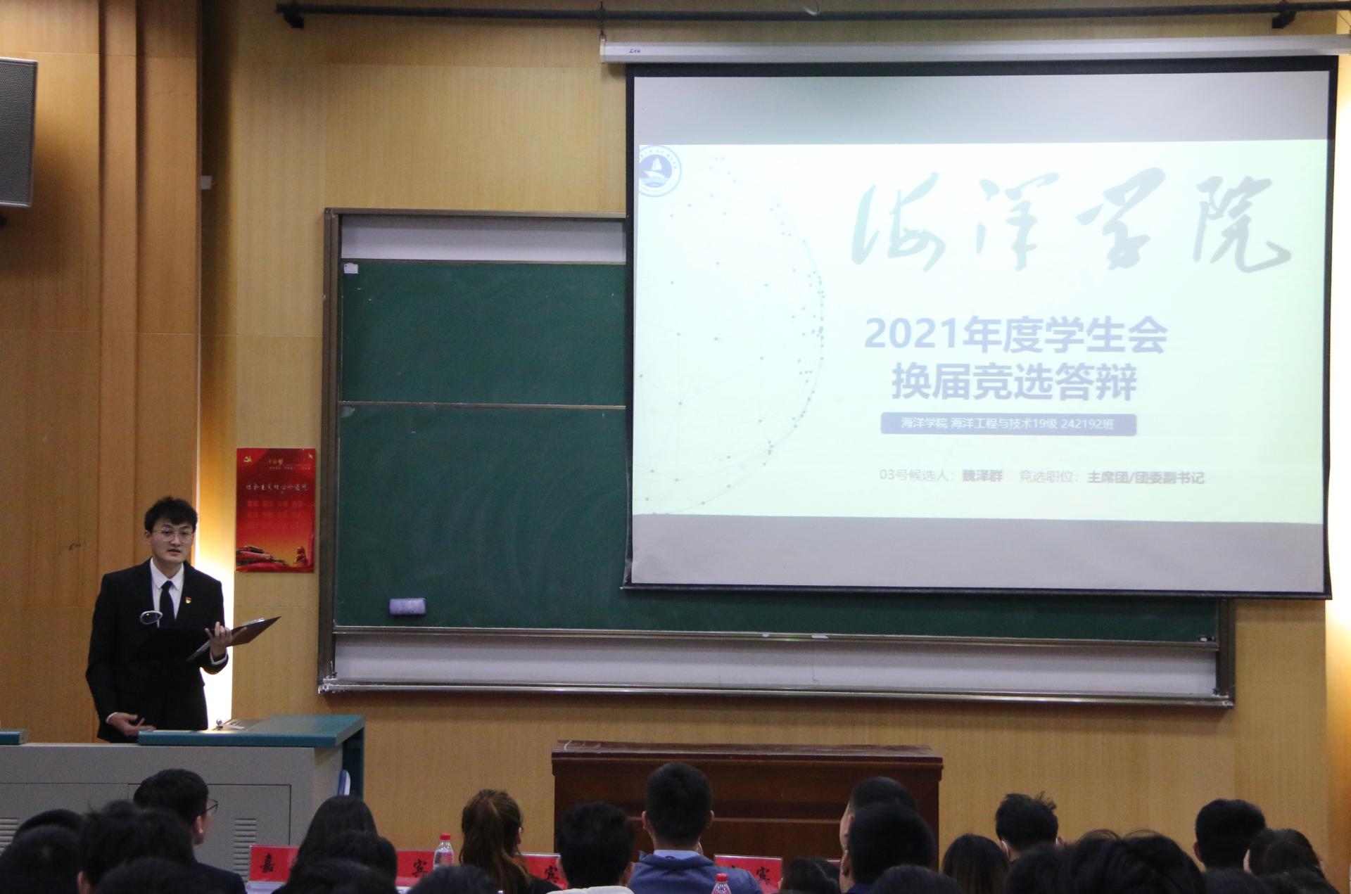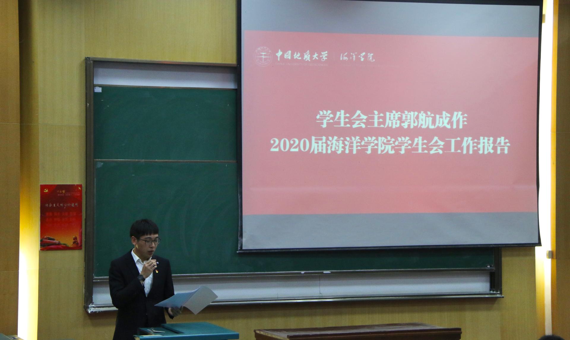 学生会执行主席郭航成向大会作题为《学习新思想,奋发新作为,改革再出发》的工作报告。报告从“着力思想引领,建设奋进海洋”、“弘扬严谨学风,搭建智慧海洋”、“立足青年成长,凸显活力海洋”、“展现学科特色,彰显卓越海洋”四个方面系统地回顾了第四次学生代表大会以来学生会的工作情况。报告指出2020-2021学年是我们继续实施并完善《团学机构改革方案》的一年,我们学生会积极响应共青团改革再出发的号角,对现有团学组织框架进行改革调整,较圆满的完成了本年度的各项工作。