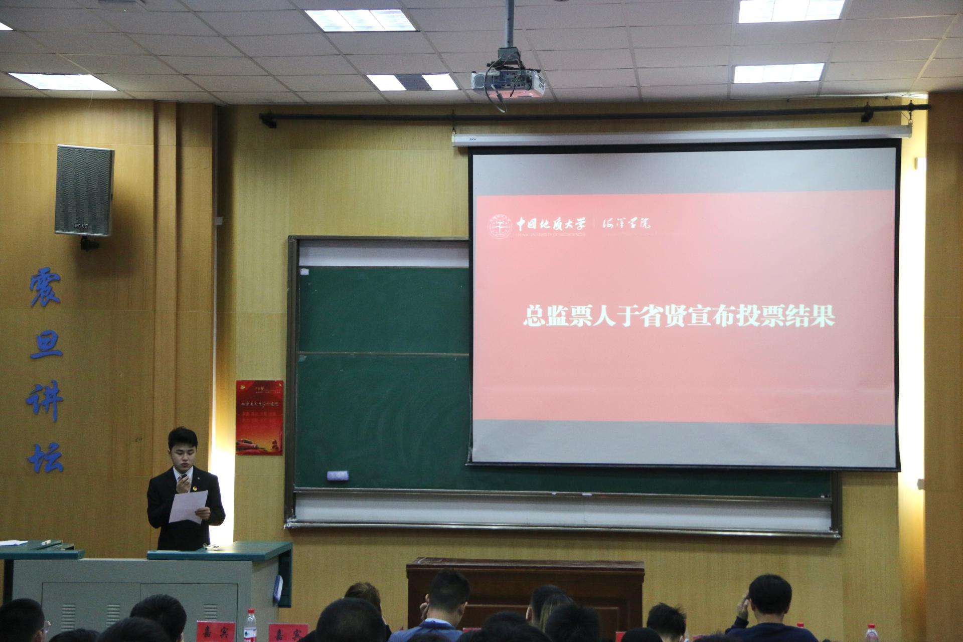 与会学生代表填写选票并投票。全体与会人员投票选举出英国上市公司官网365第五届学生委员会常务委员10名,以及英国上市公司官网365学生会主席团成员5名,团委副书记1名。由总监票人于省贤向全体与会代表公布选票的计票情况。