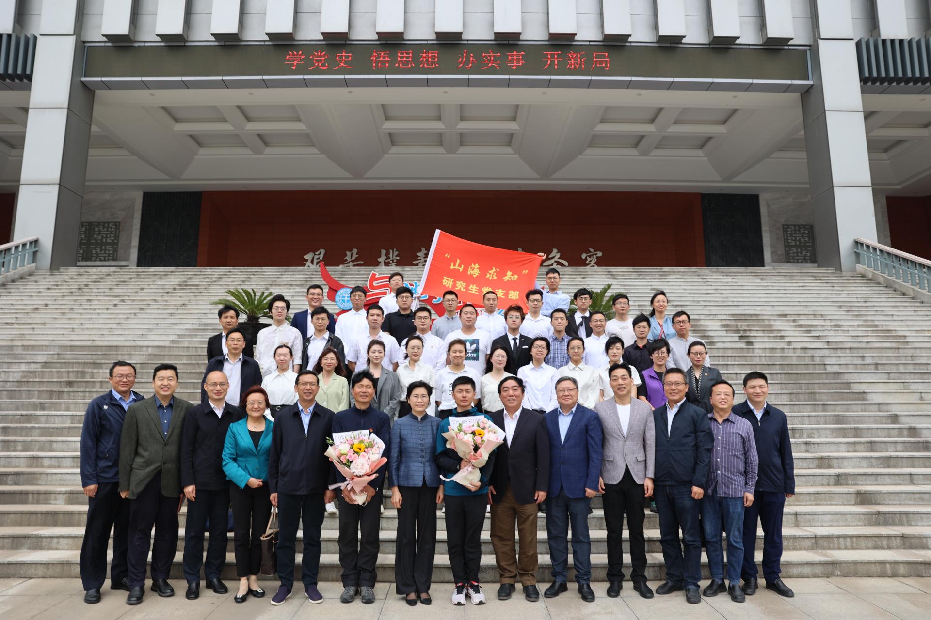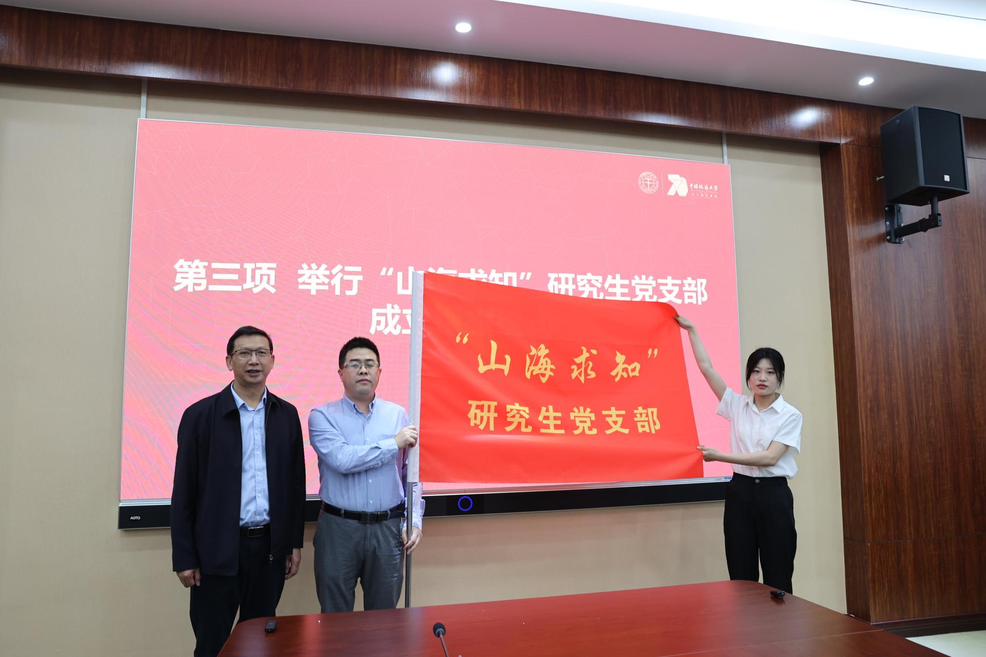 座谈会上,“山海求知”研究生党支部正式成立。党委副书记成金华为“山海求知”研究生党支部授旗。党支部书记杜学斌教授和党支部副书记吴娜同志代表党支部接旗。