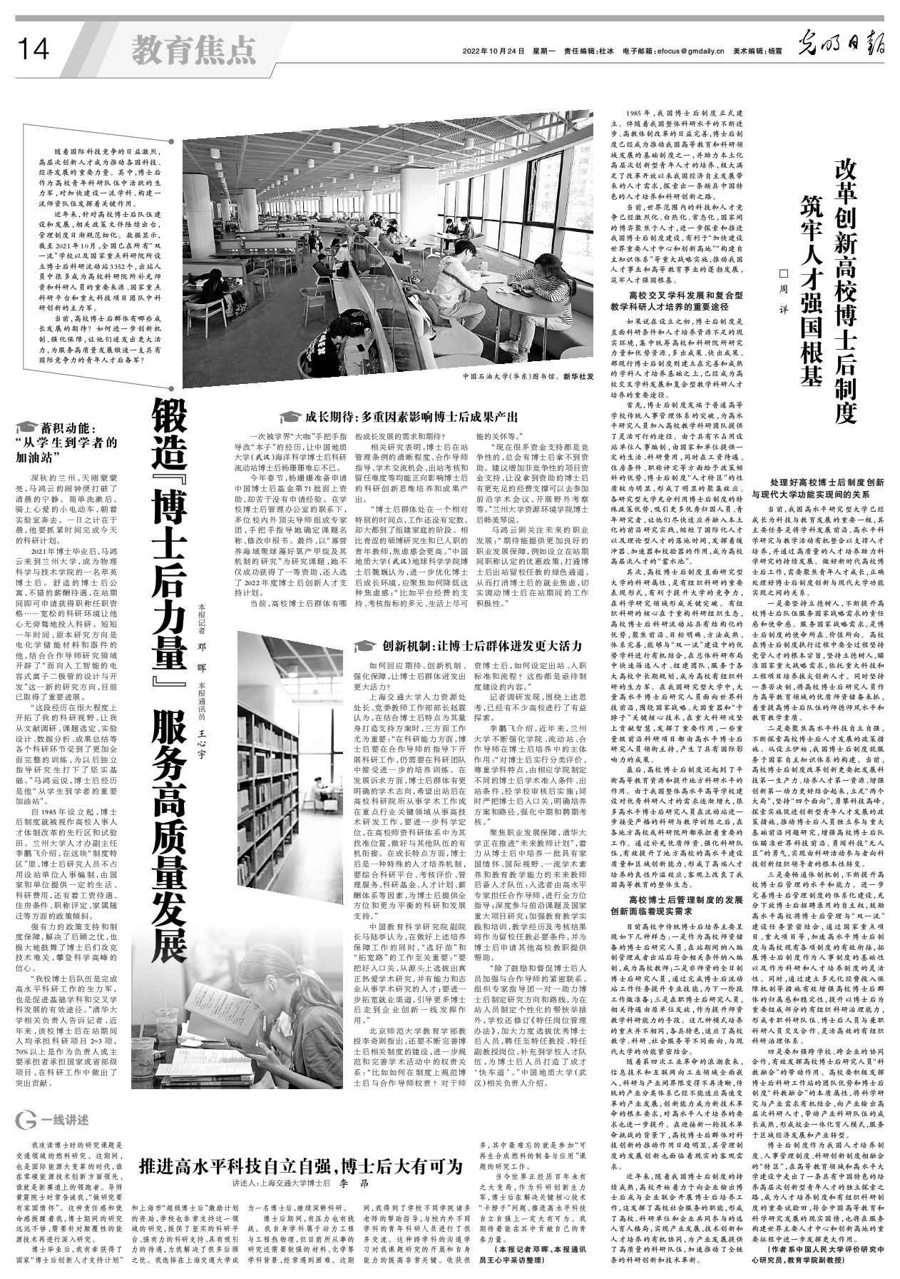 2022年10月24日,光明日报发表了一篇题为《锻造“博士后力量” 服务高质量发展》的报道。在“成长期待:多重因素影响博士后成果产出”版块中,报道了我们博士后杨姗姗项目申报经历:今年春节,杨姗姗准备申请中国博士后基金第71批面上资助,却苦于没有申请经验。在学校博士后管理办公室的联系下,多位校内外顶尖导师组成专家团,手把手指导她确定课题名称、修改申报书。最终,以“寡营养海域聚球藻好氧产甲烷及其机制的研究”为研究课题,她不仅成功获得了一等资助,还入选了2022年度博士后创新人才支持计划。
