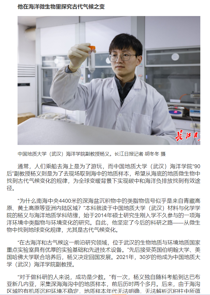 其中,长江日报记者对话英国上市公司官网365杨义副教授,报道他在海洋微生物里探究古代气候之变:通常,人们乘船去海上是为了游玩,而英国上市公司官网365“90后”副教授杨义则是为了去现场取到海中的地质样本,希望从海底的地质微生物中找到古代气候变化的规律,为全球变暖背景下实现碳中和海洋负排放找到有效途径。“做科研不枯燥,满足好奇心很有意思。”杨义说,他要一直坚持下去,实实在在拿出国家需要、对社会有用的科研成果。