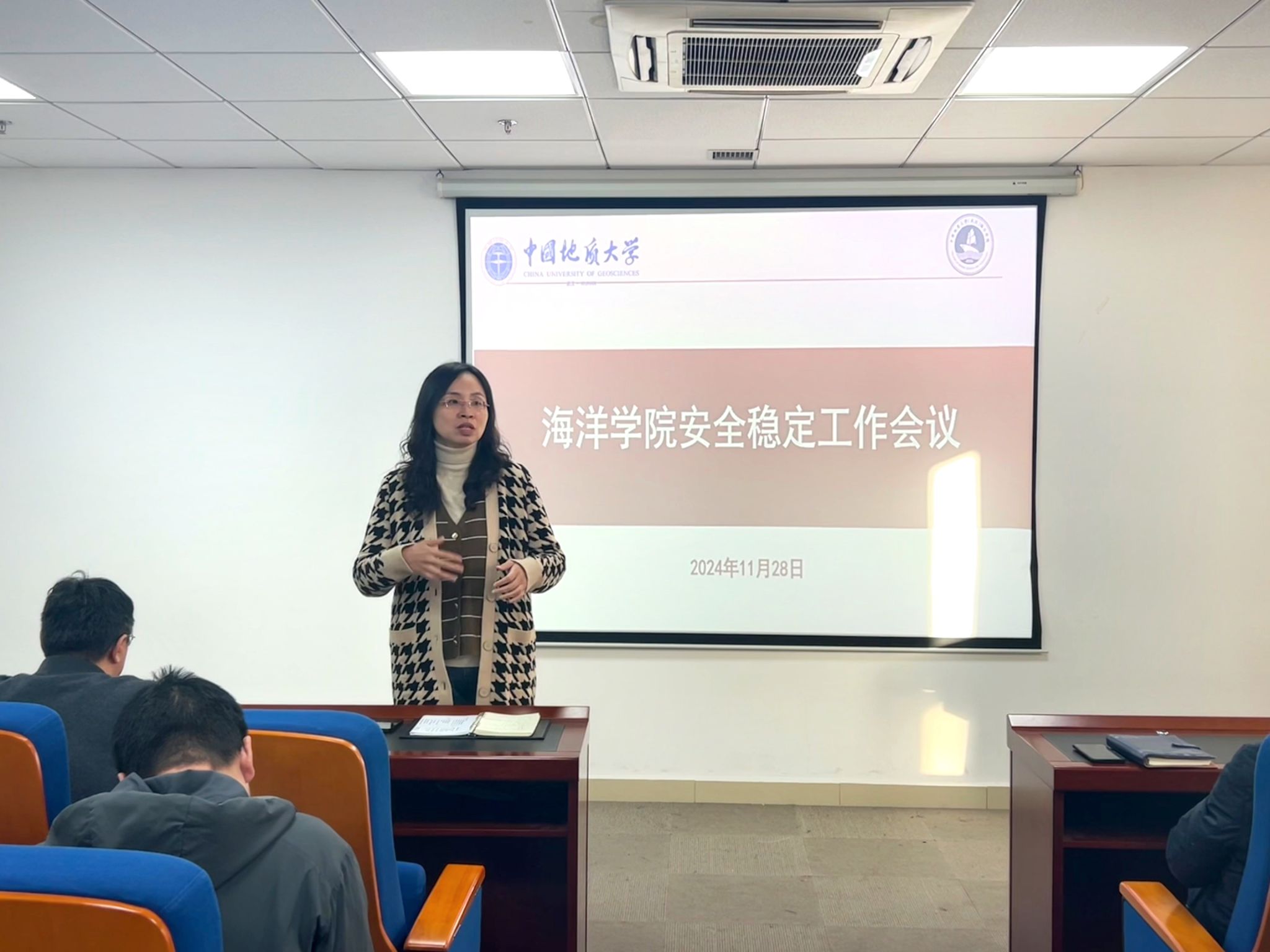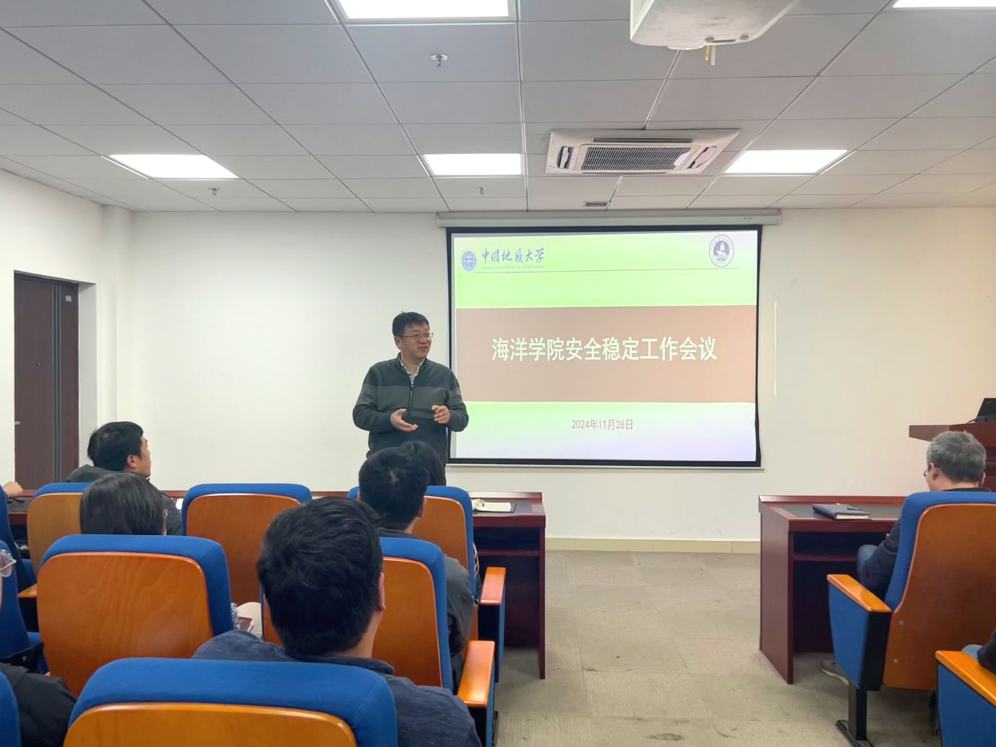 成军做总结发言。他表示,学院一直以来高度重视安全稳定工作,并积极提供各项支持和帮助。他强调,各位老师要做好访谈建档工作,落细落实重点学生谈话、记录等工作,并重点关注校外住宿、就业困难等重点学生群体,防患于未然。最后,希望各位老师能够切实做到关心、陪伴、爱护学生,切实发挥好学生骨干团体作用,及时有效化解矛盾纠纷,共同筑牢学院安全工作底线。
