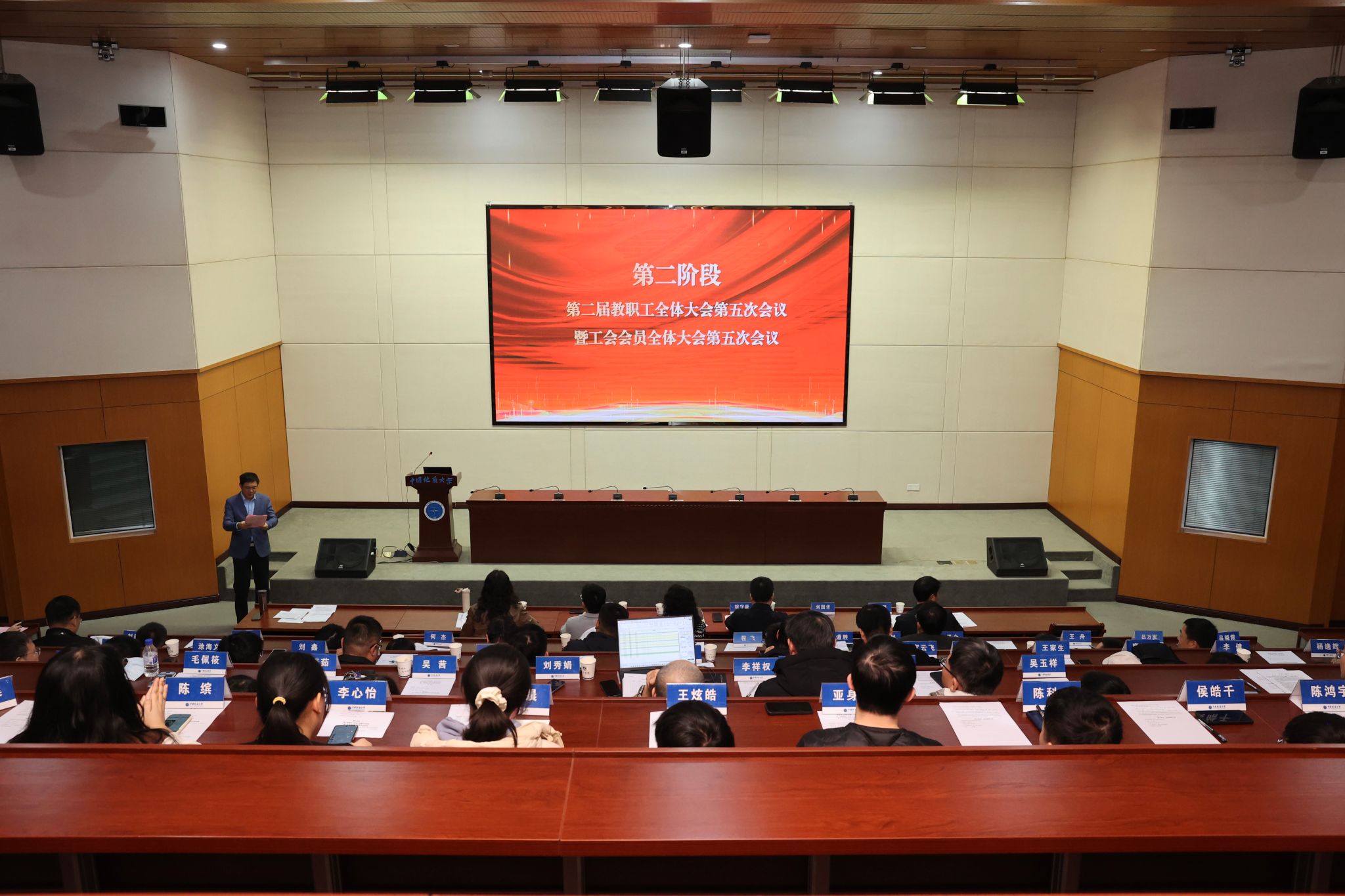 孙启良作学院2025年度工作报告。他详细介绍了学院“十四五”期间工作完成情况;学院2025年在党建与思政工作、教育教学与人才培养、师资队伍建设、科学研究与社会服务、国际交流与平台建设等方面取得的成绩。会上,孙启良还报告了学院2025年度财务收支情况。