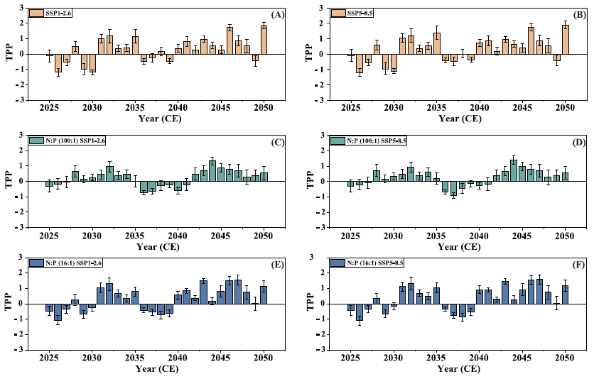 利用广义加性模型预测未来2025-2050年不同增温场景和营养盐调控水平下东海区域生产力的变化特征。结果均指示着未来全球暖模式下区域初级生产力水平将持续增加。在不同场景下,2035-2040存在着初级生产力的波动,结合前人模型资料,推测此时区域海洋生产力结构将发生显著改变,甲藻将进一步占据竞争优势,暗示着未来藻华发生的频次可能显著提升。同时模型结果也表明单一因子调控营养盐或者温度的变化对于改善区域初级生产力的作用有限,而未来海洋藻华的治理需要综合考虑多因素协同调控。