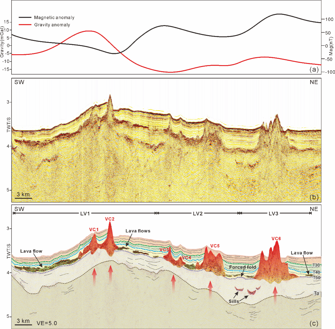 火山多呈圆形或椭圆形,不规则的分布在大陆边缘沉积盆地中。然而,基于南海西北陆缘的西沙隆起周缘的多波束资料,发现了罕见的NW/WNW走向的线性构造(图1),利用高精度二维地震剖面和重力/磁力数据,将它们解释为线性火山构造(图2)。经过与世界其他地区的线性火山比较,研究区内的线性火山构造是岩浆沿相似走向的断层系统集中喷发,形成的裂隙式喷发产物。