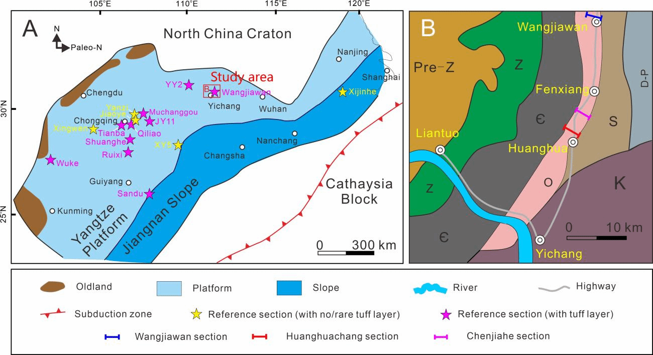 奥陶纪是地球表层生物环境突变的关键转折期,温室气候在这一时期被逐渐打破,海洋生物迎来了蓬勃发展(奥陶纪生物大辐射事件,GOBE),直至奥陶纪末期全球气候发生剧烈波动(赫南特冰期),诱发了显生宙第一次大灭绝(晚奥陶世生物大灭绝,LOME)。传统观点认为,奥陶纪降温过程从早奥陶世初期持续加强,可能与造山运动和早期陆地植物扩张引发的硅酸盐风化增强,海洋初级生产力提高,及由此导致的大气二氧化碳浓度下降等因素相关,而最终赫南特冰期的形成可能归因于强烈的大陆弧火山作用(导致华南奥陶系-志留系之交广泛且频繁出现的火山凝灰岩)的贡献。目前有关奥陶纪气候、环境、生物事件的精细过程和驱动机制研究多聚焦于LOME,缺乏对跨度约~40个百万年的整个奥陶纪的宏观分析,地球深部岩浆作用与奥陶纪气候演变的耦合关系仍难以确定。