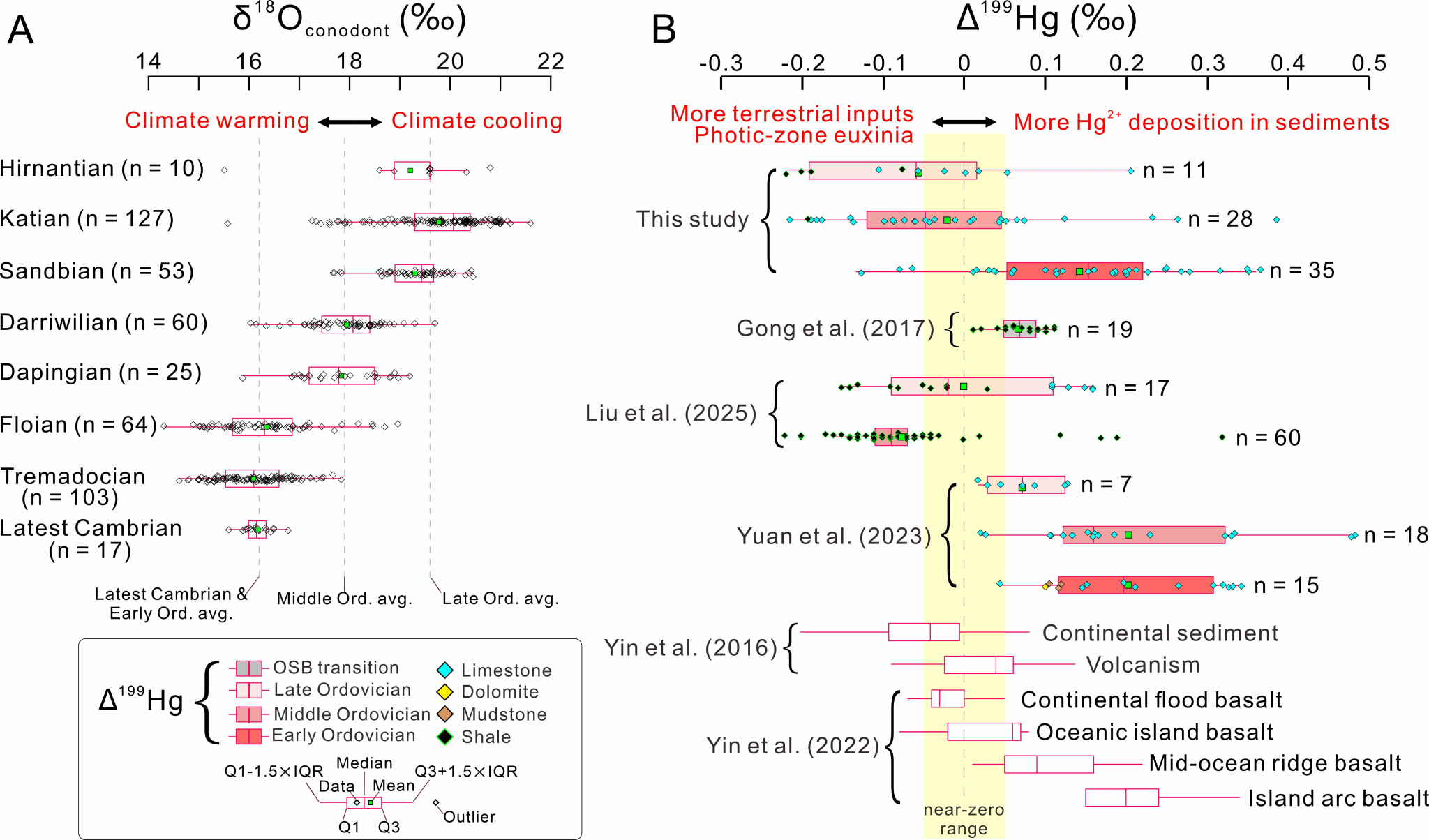 图3. 奥陶纪牙形石氧同位素(左)与汞同位素非质量分馏(右)箱线图