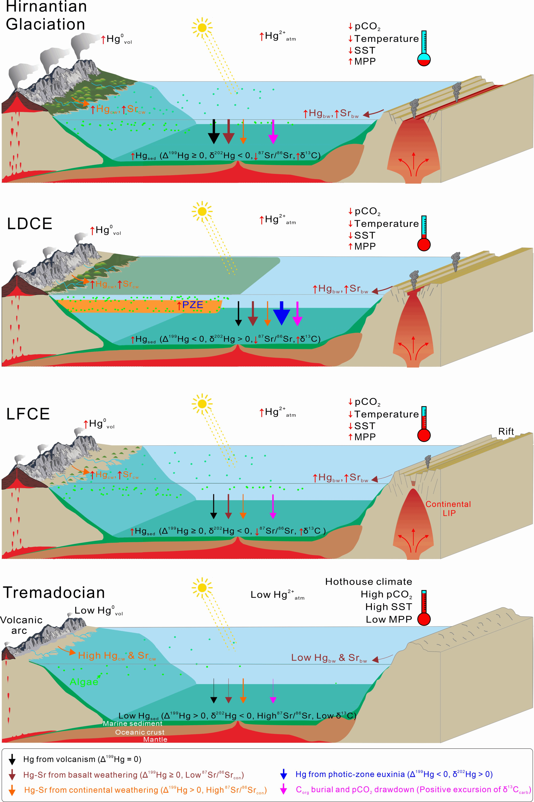 图5. 奥陶纪火山-气候相互作用及海相沉积地球化学响应示意图。LFCE = 弗洛期末期降温事件;LDCE = 达瑞威尔期末期降温事件;MPP = 海洋初级生产力;SST = 海水表层温度;vol = 火山; sed = 沉积物; atm = 大气; cw = 大陆风化; bw = 玄武岩风化