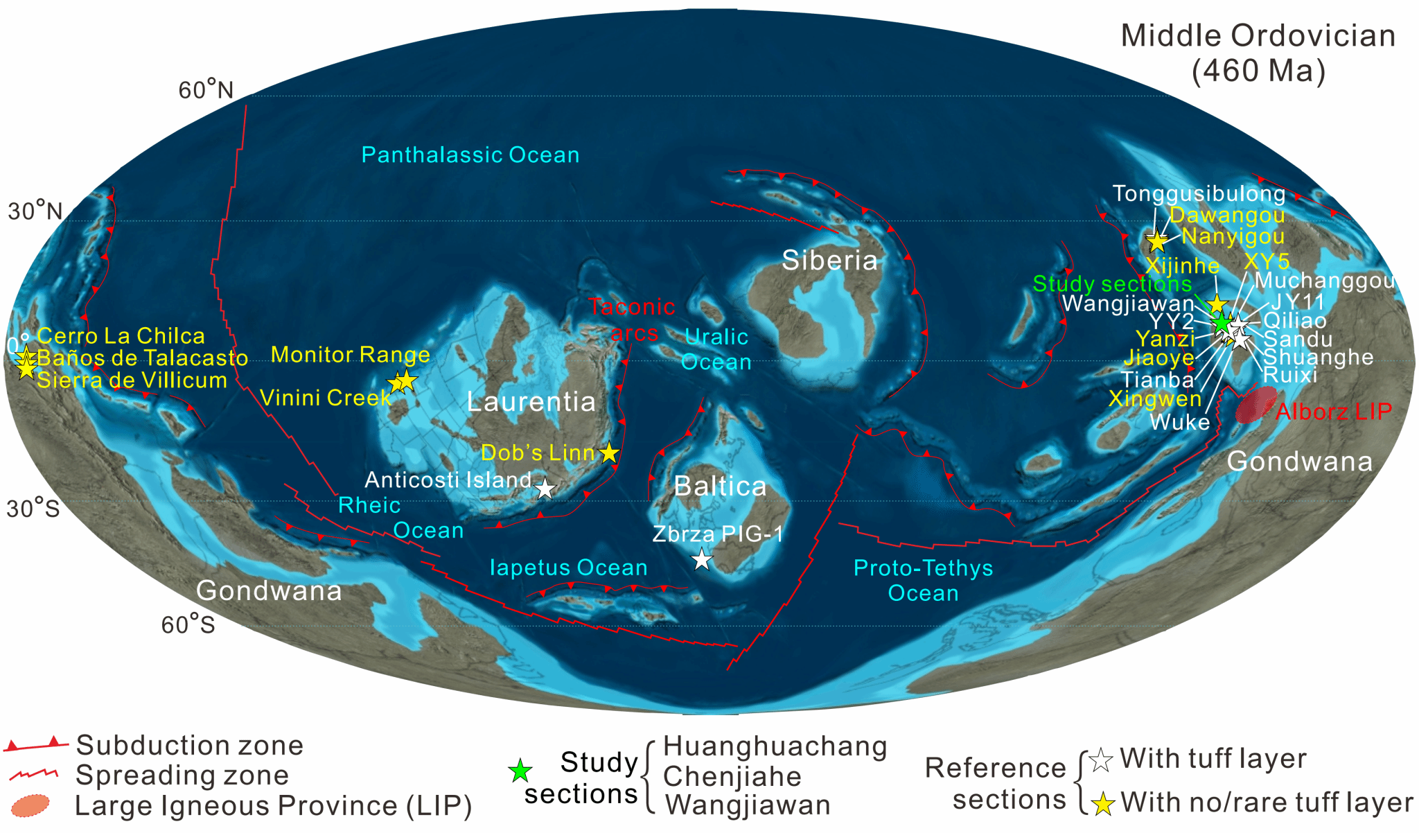 全球奥陶系(及研究剖面)火山灰地层时空分布特征与地层Hg富集无耦合关系,表明大陆弧火山作用并非驱动多阶段汞富集的主因,而可能与大火成岩省类型火山作用有关。目前已知的大火成岩省(如Alborz和Pinghe LIP)和前人多类别综合指标(构造、岩石/矿石、地球化学、古地磁)和碳循环与风化模型研究共同指示奥陶纪大火成岩省的存在,这与奥陶纪部分Hg富集时段可相互对应,进一步揭示LIP火山作用可能是导致全球海洋沉积物汞富集的主要原因。