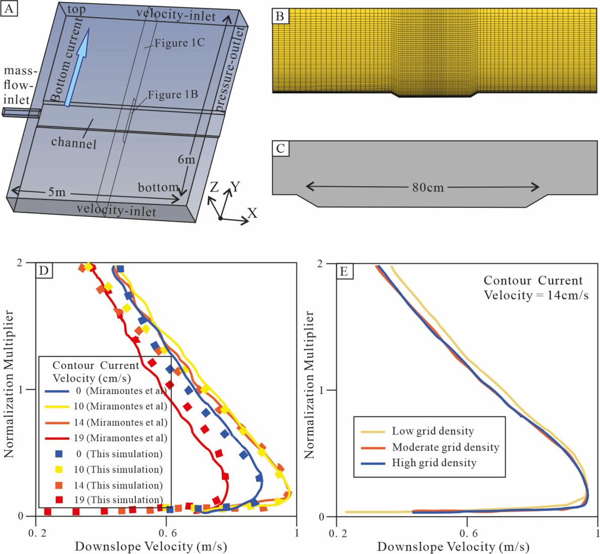 图1. (A)模型示意图。(B)数值模拟中的网格截面。(C)模型中应用的水道截面。(D)与 Miramontes 等人(2020)的水槽实验模型验证。(E)网格无关性分析。(B、C)的截面位置均标注于(A)中。