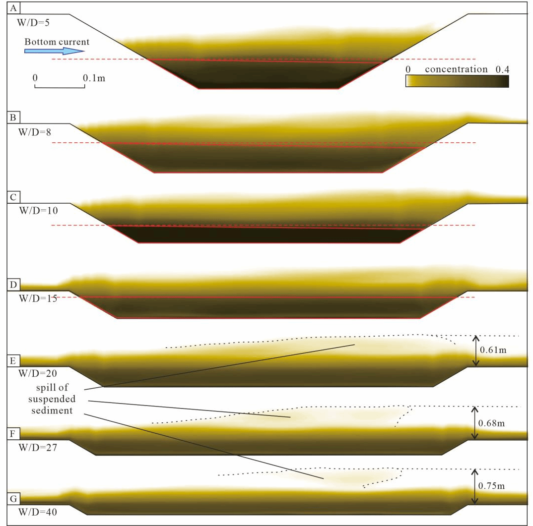 针对上述问题,研究基于对前人地震资料的分析和数值模拟手段,构建了一系列具有不同宽深比的水道模型,依托Fluent数值模拟平台,采用基于有限体积法的欧拉多相流模型,求解海水—沉积物颗粒的质量与动量守恒方程,系统分析重力流—底流交互背景下流体—沉积耦合行为。通过比较不同宽深比条件下水道内的流体结构特征,从流体动力学角度深入探讨重力流与底流共同控制下不同限制性水道的迁移机制。