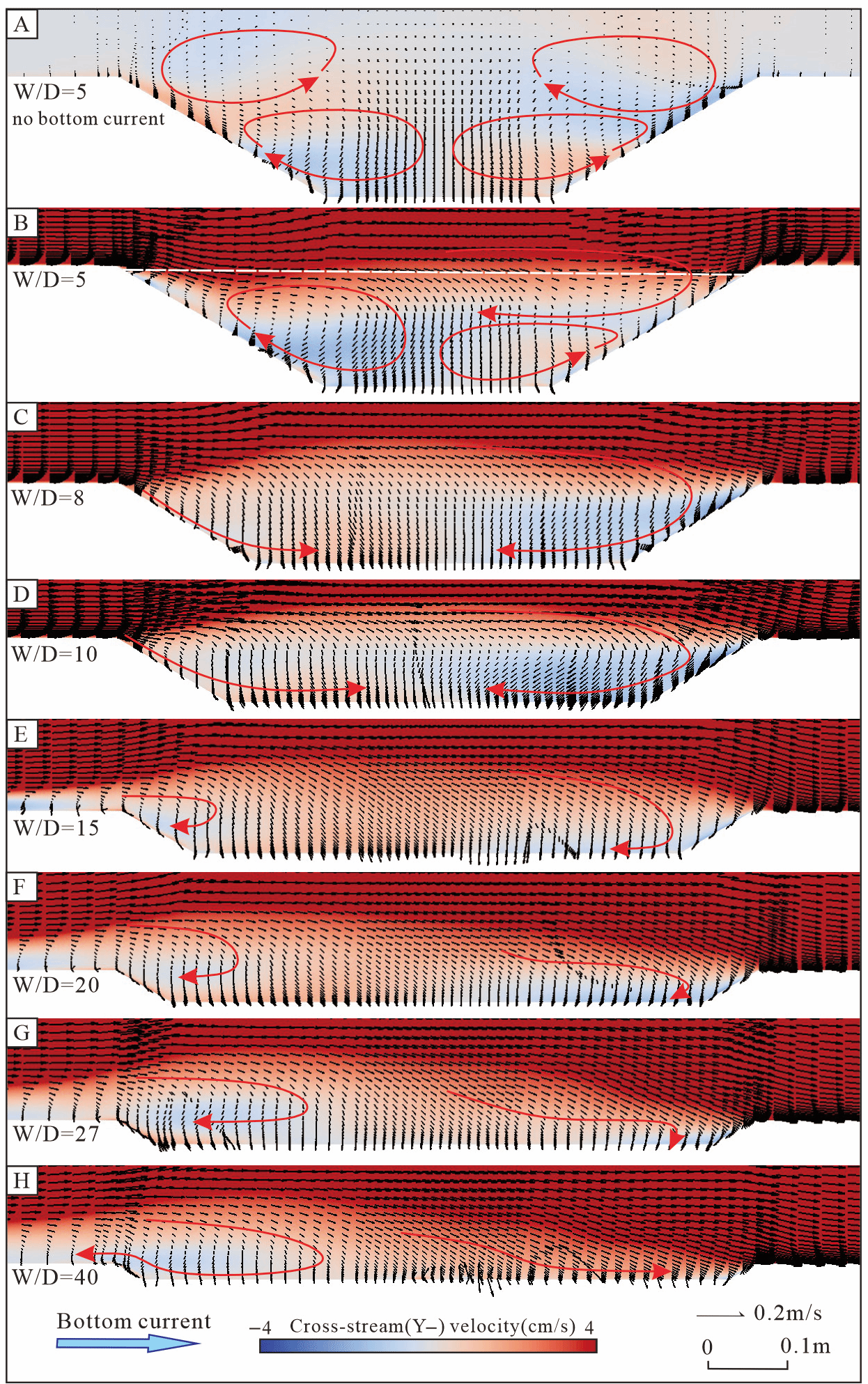 图5. 不同宽深比下的底流方向速度。红色箭头标示二次流的位置与方向