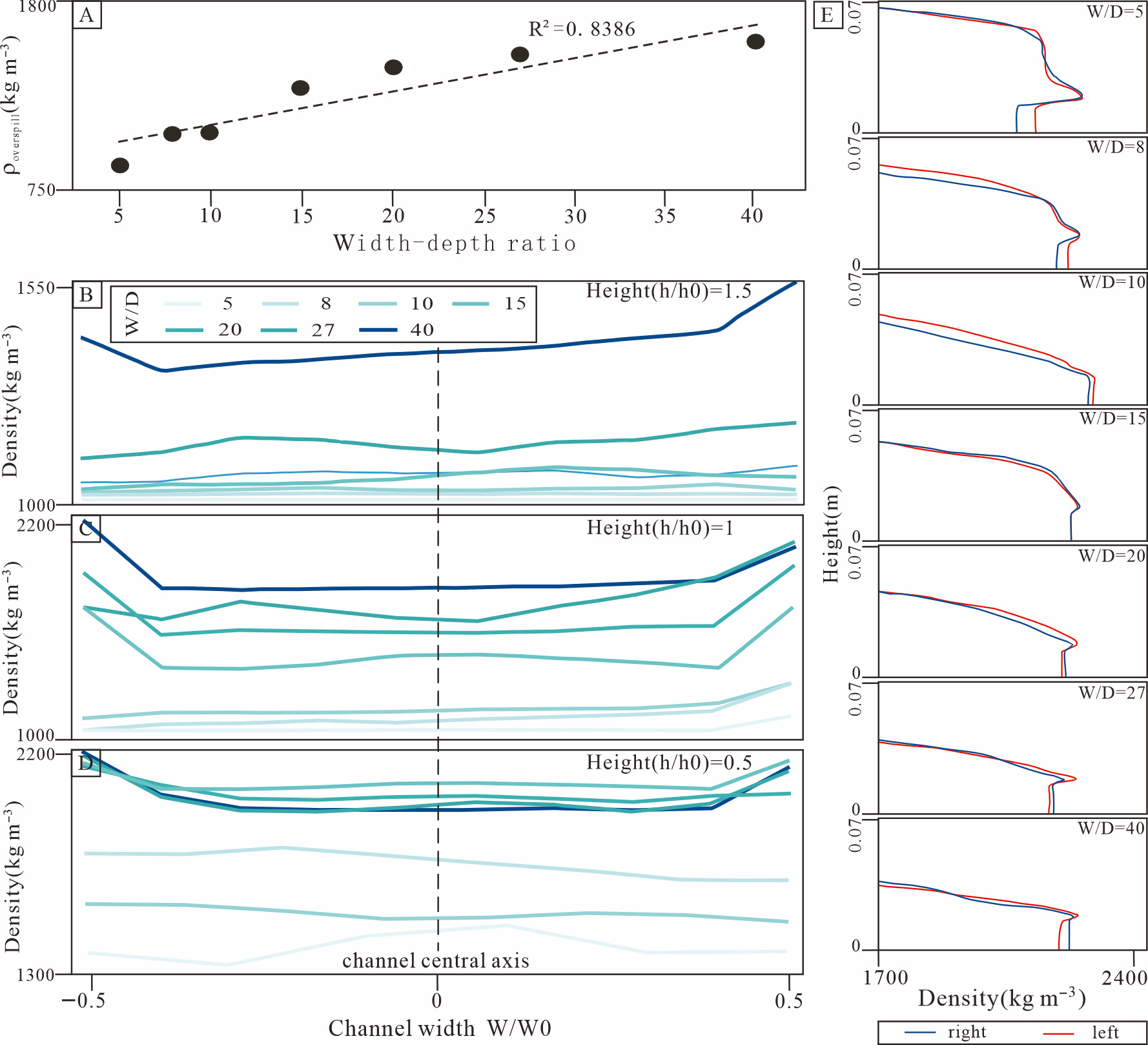 图9. (A) 流体平均溢流密度随宽深比增大而增加。(B–D)水道内流体密度的横向分布,分别对应深度的1.5倍、1倍和0.5倍高度。宽深比较大的水道表现出更高的溢流高度。(E) 不同宽深比下水道两侧流体密度对比。随着宽深比增大,近床层密度分布从左侧较高(红线)向右侧偏移至较高(蓝线)。